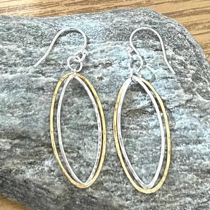 These dainty two tone earrings consist of hand hammered sterling silver & 14k gold filled marquise & oval shaped links. They are very comfortable on the ear. Eye catching yet not at all heavy. You may choose between regular & lever back ear wires.