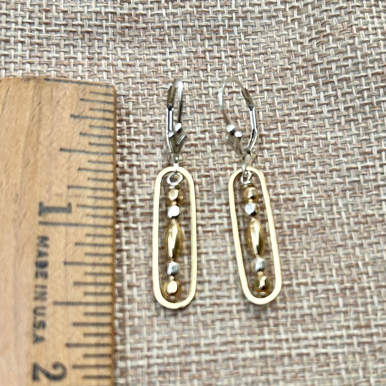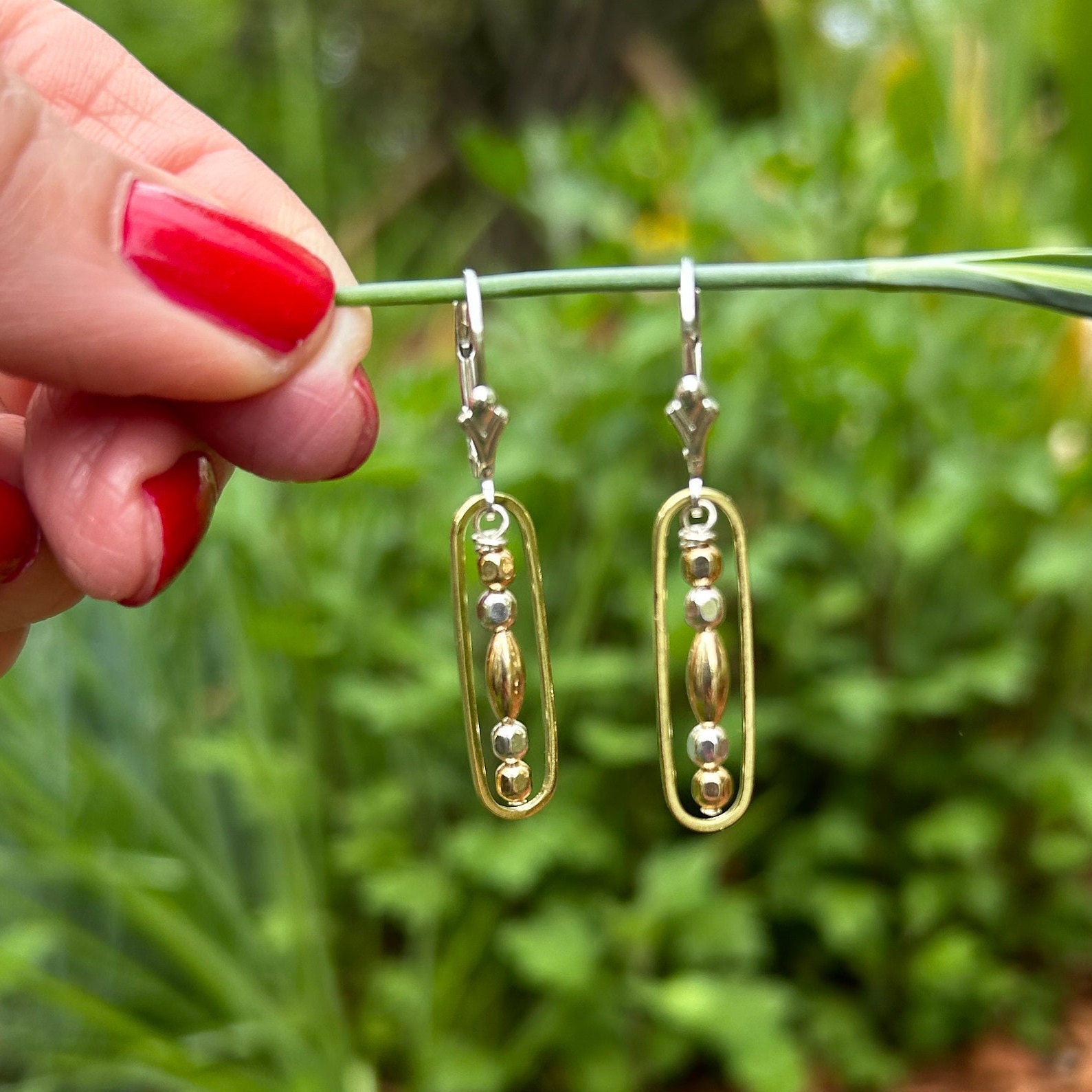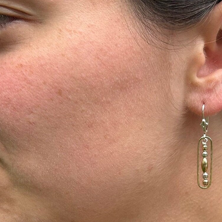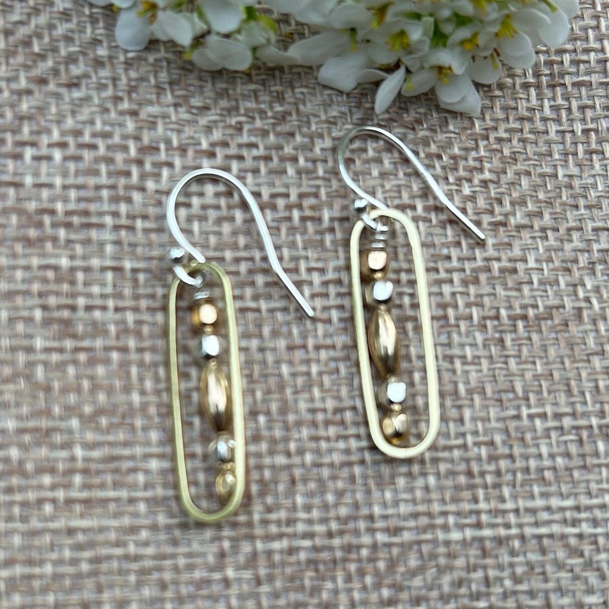 Sterling silver & 14k gold filled beads unite to form these delicate everyday earrings. One brass oval gives each of these earrings a stunning two tone look. You may choose between sterling silver lever back ear wires or regular ear wires.