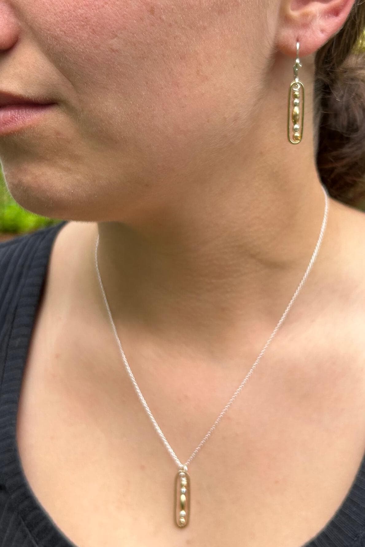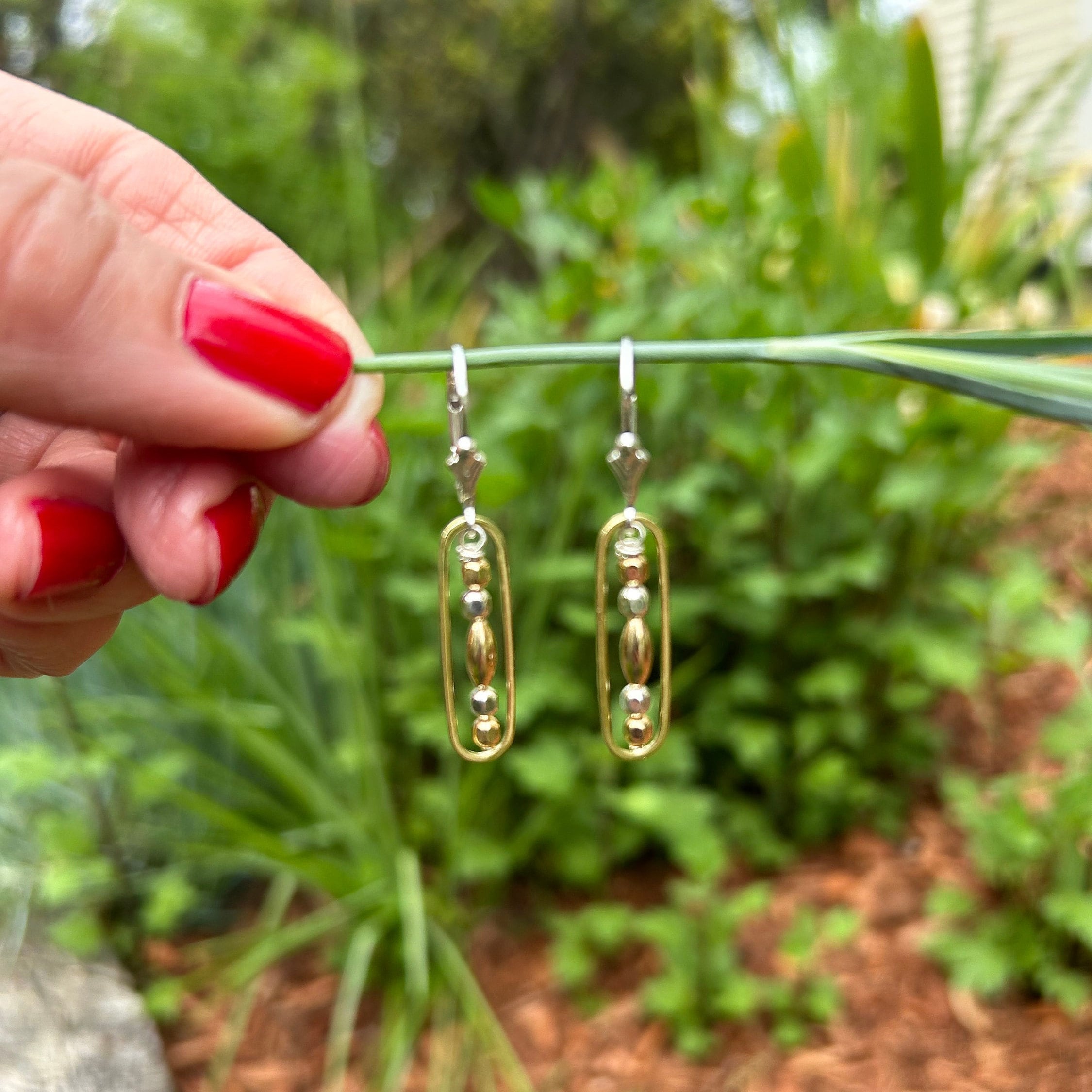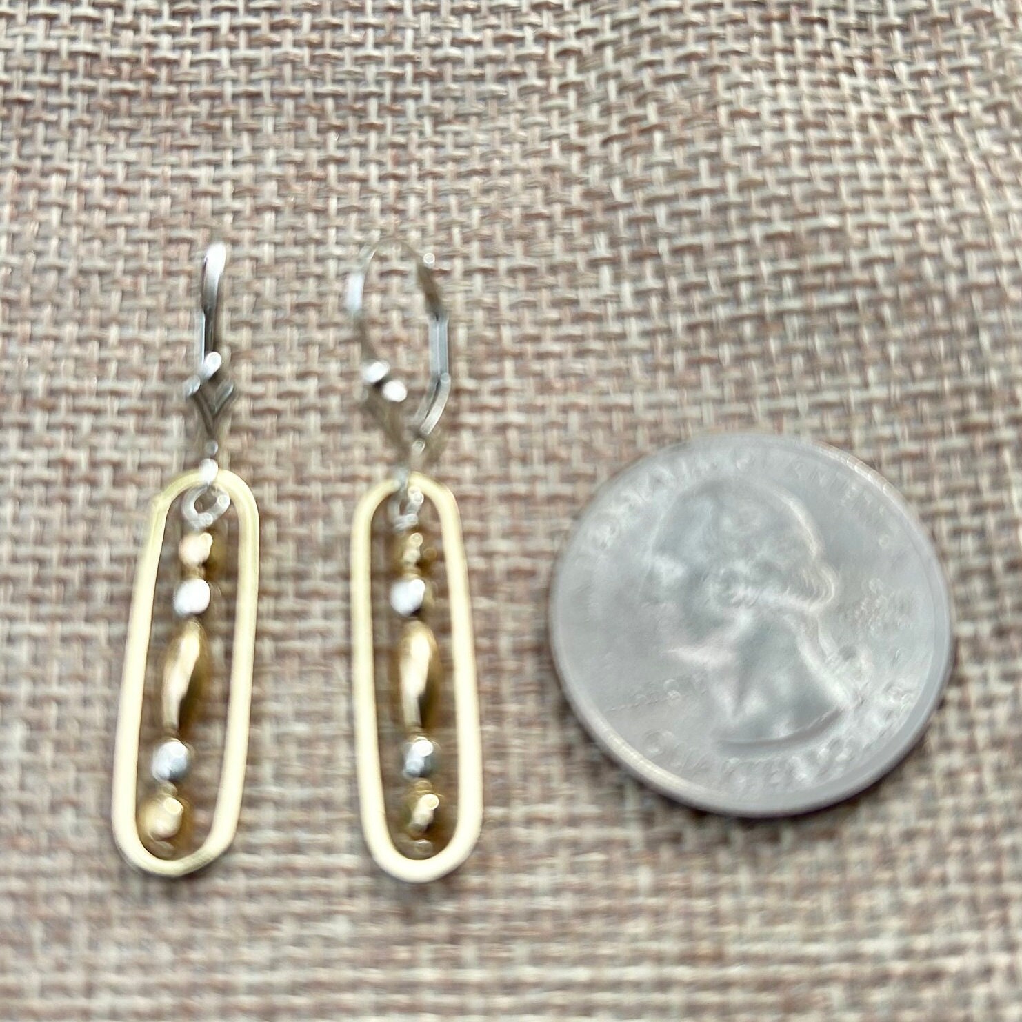 Sterling silver & 14k gold filled beads unite to form these delicate everyday earrings. One brass oval gives each of these earrings a stunning two tone look. You may choose between sterling silver lever back ear wires or regular ear wires.