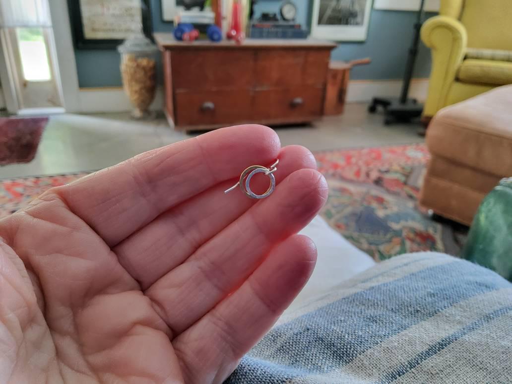 Two hand hammered circles unite to form these delicate everyday earrings. One sterling silver & one 14k gold filled circle give these earrings a stunning two tone look.